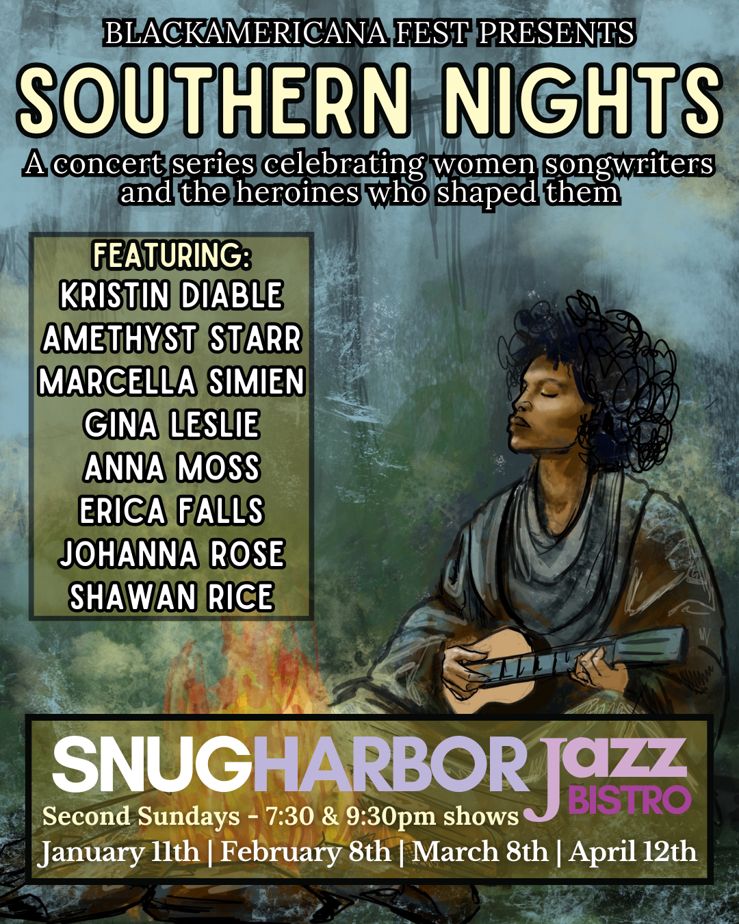 Southern Nights is an intimate songwriter series presented by BlackAmericana Fest, returning for Season 4 at Snug Harbor Jazz Bistro. Curated by Dusky Waters, the series celebrates women songwriters, original music, and the heroines who shaped us, centering storytelling, collaboration, and the living roots of American music. Grounded in the South and expansive in spirit, Southern Nights is a space where lineage, creativity, and community meet.